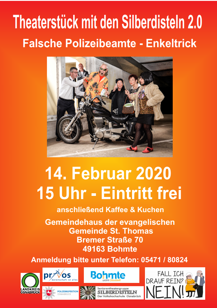 In Kooperation mit der Polizeiinspektion und dem Präventionsverein Osnabrück sowie unter Mitwirkung der Theatergruppe „Silberdisteln 2.0“ möchte die Gemeinde Bohmte die Seniorinnen und Senioren herzlich zu diesem Theaterstück einladen, das am Freitag, 14. Februar 2020, 15.00 Uhr, im Gemeindehaus der ev.-luth. Kirchengemeinde St. Thomas, Bremer Str. 70, 49163 Bohmte, stattfindet. Der Eintritt ist frei!