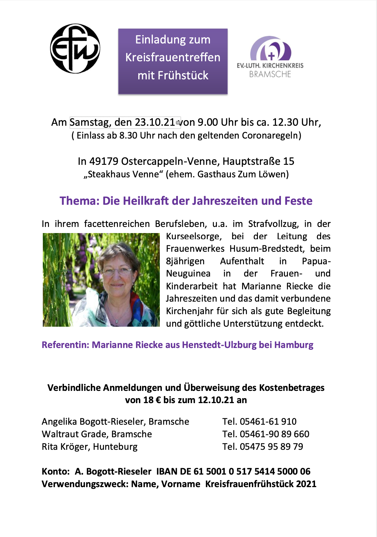 Einladung zum Kreisfrauentreffen mit Frühtstück am Samstag, den 23.10.21 von 9.00 Uhr bis ca. 12.30 Uhr.