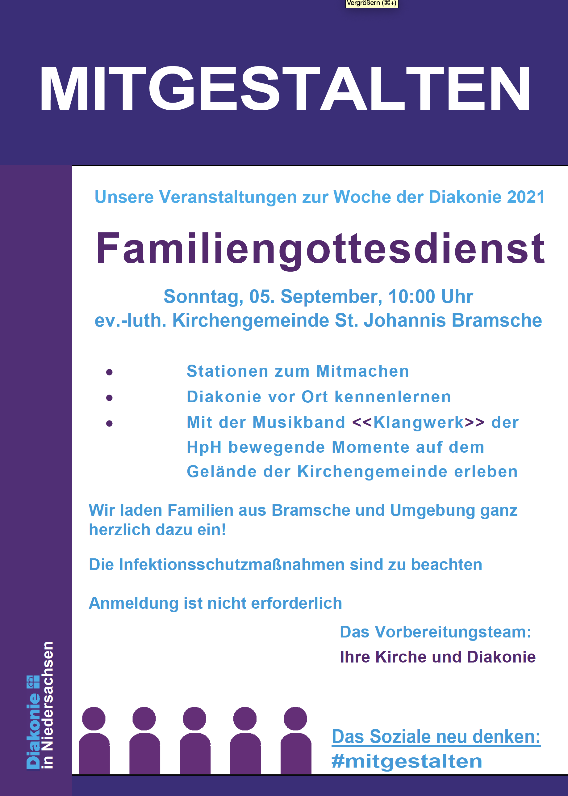 Diakonie-Gottesdienst in der St. Johannis Kirche Bramsche-Gartenstadt am Sonntag, den 05.09.2021 um 10:00 Uhr. Den Gottesdienst hält Superintendent J. G. Cierpka. Viele Kirchen- und Diakonieakteure bringen sich in den Gottesdienst und in das Begegnungsprogramm nach dem Gottesdienst ein.
