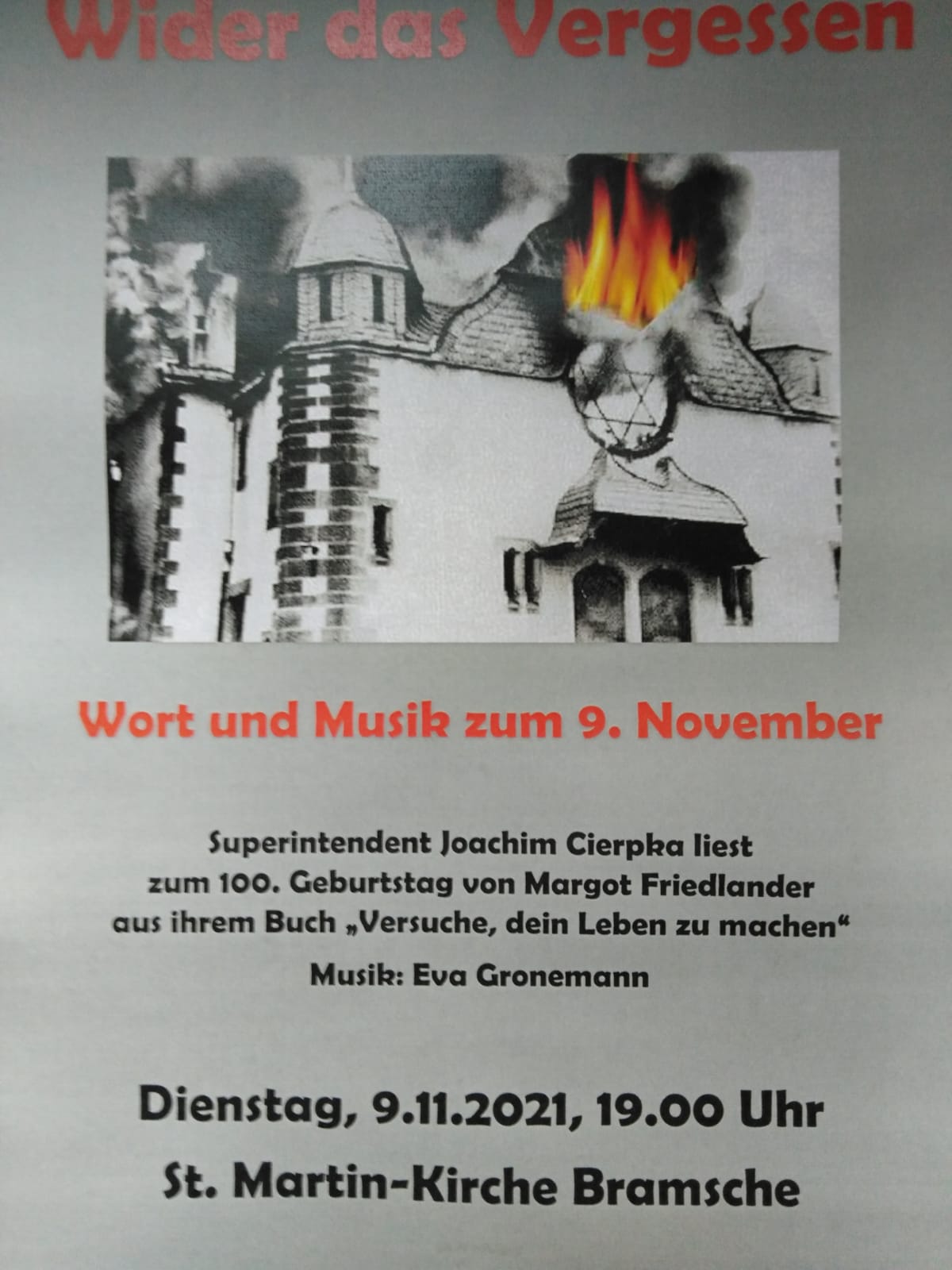 Am 09.11. läd Superintendent Joachim Cierpka in die St. Martin Kirche in Bramsche ein. Dort ließt er zum 100. Geburtstag von Margott Friedlander aus ihrem Buch: "Versuche, dein Leben zu machen".