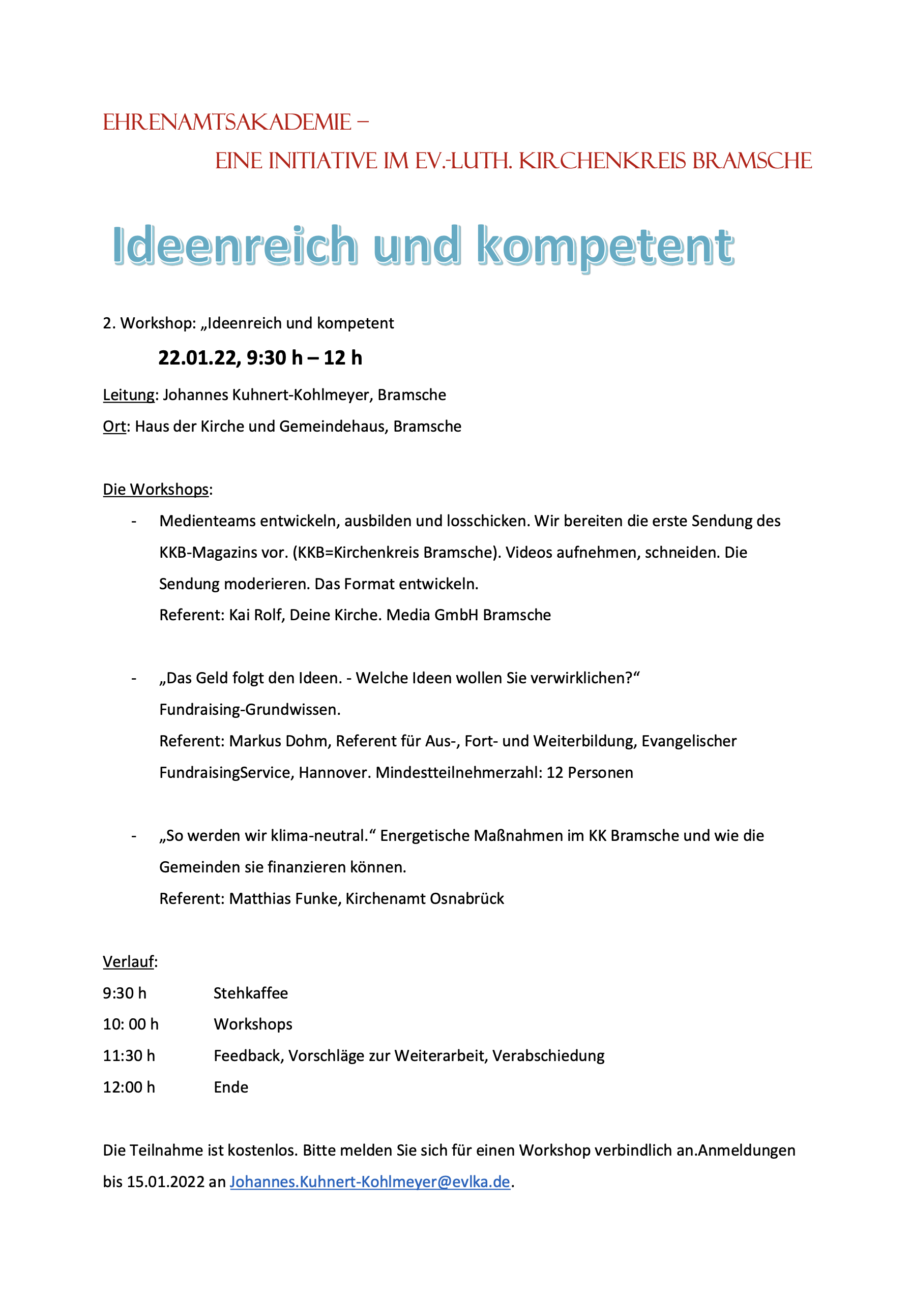 Am 22.01.2022 gibt es einen weiteren Workshop Tag der Ehrenamtsakademie im Kirchenkreis Bramsche.