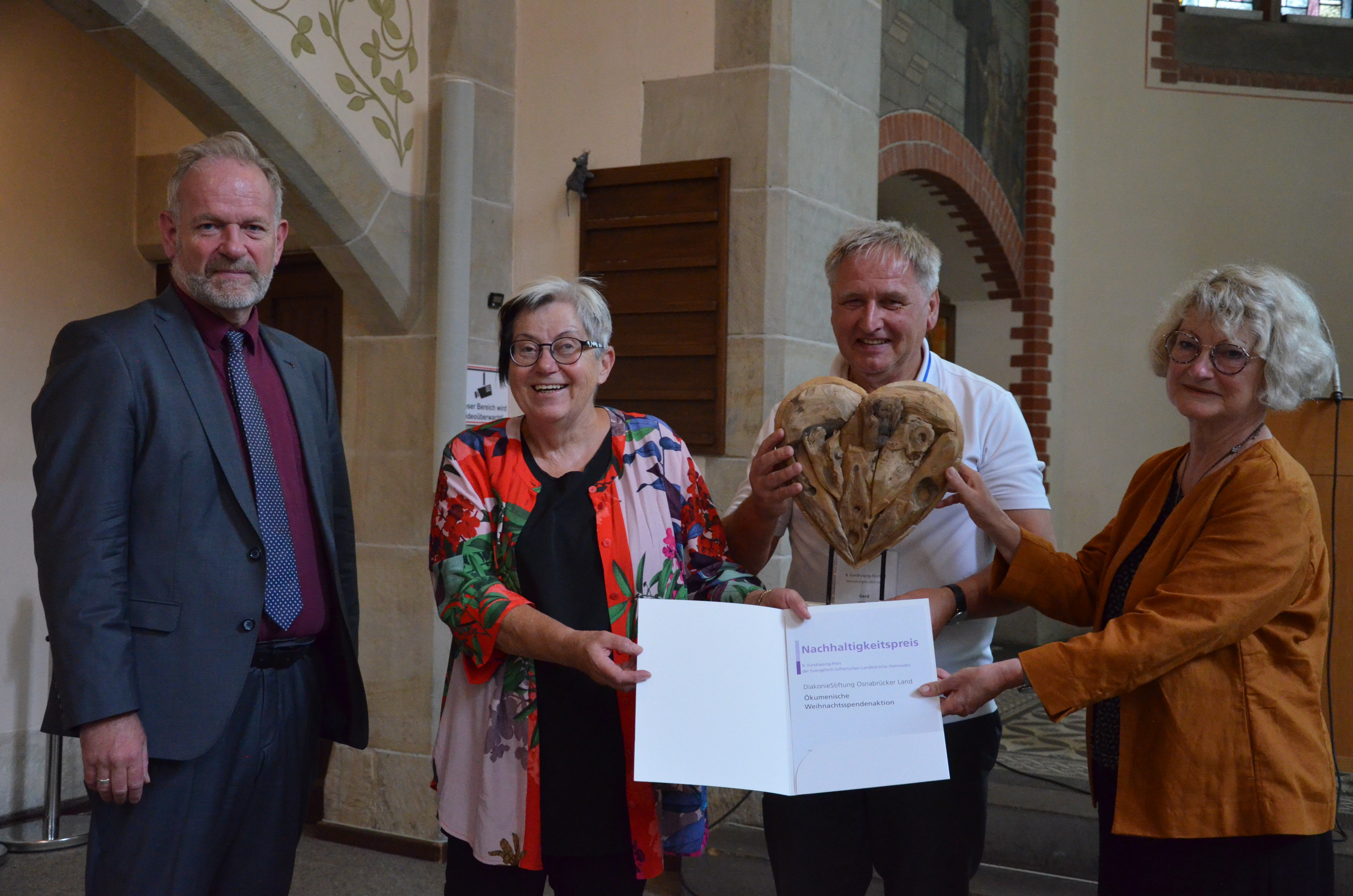 Neben den fünf weiteren Preisträgern wurde die DiakonieStiftung Osnabrücker Land mit dem Nachhaltigkeitspreis ausgezeichnet für ihre Ökumenische Weihnachtsspendenaktion. Laudator Paul Dalby ist voll des Lobes, wenn er dem weit vernetzten Projekt bescheinigt: „Aus der Region etwas weiter im Westen ist diese Aktion jedenfalls nicht mehr wegzudenken!“